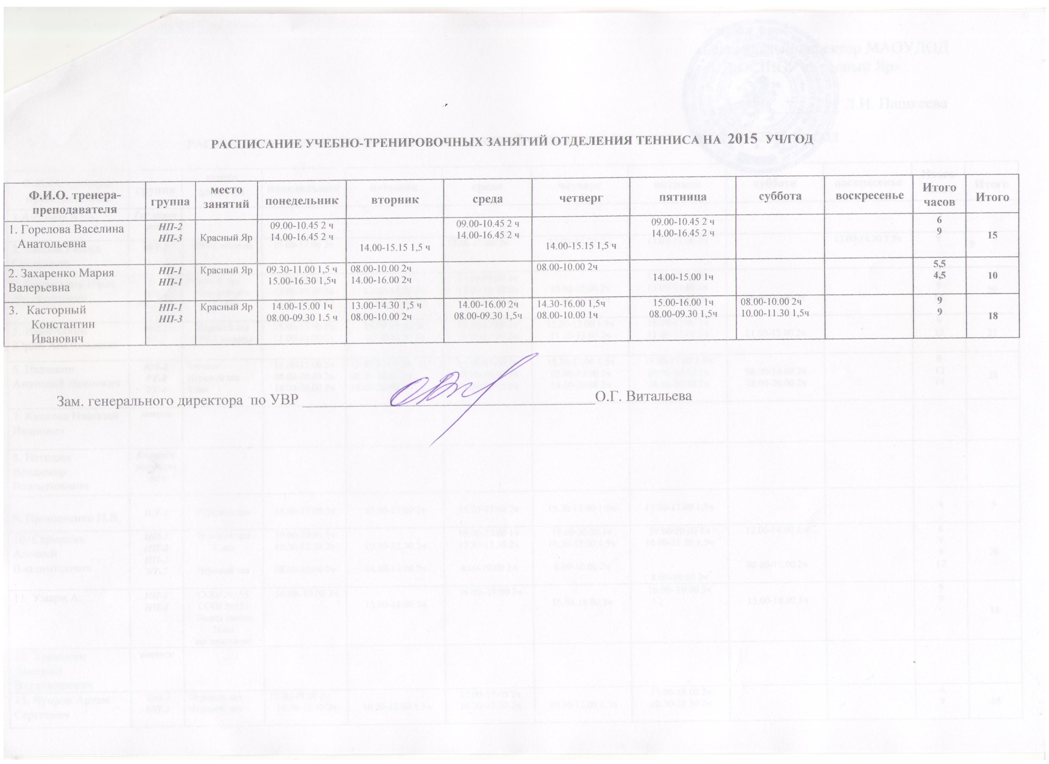 Расписание учебно-тренировочных занятий отделения "Теннис" от 01 октября 2015 уч/год (Скан)