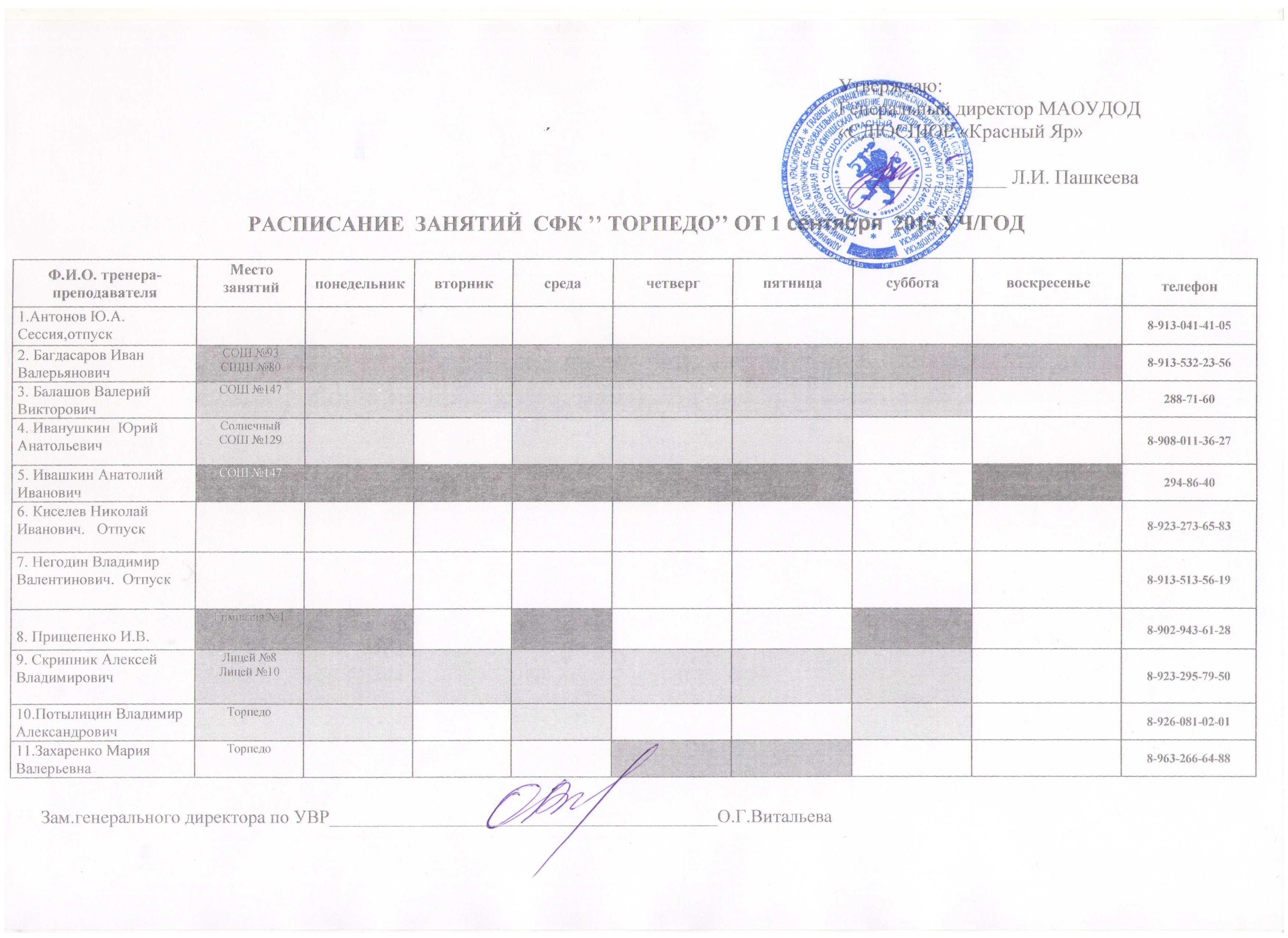 Расписание занятий СФК "Торпедо" от 01 октября 2015 уч/год (Скан)