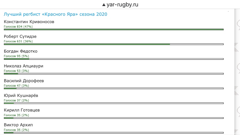 По традиции болельщики и специалисты определяли лучшего регбиста РК «Красный Яр». Если раньше обязательно находился регбист, который побеждал в голосовании с приличным отрывом, то в год пандемии определить лучшего было очень трудно. Столб Кирилл Готовцев с перевесом в 0.5 голоса впервые в истории признан лучшим регбистом «Красного Яра»!