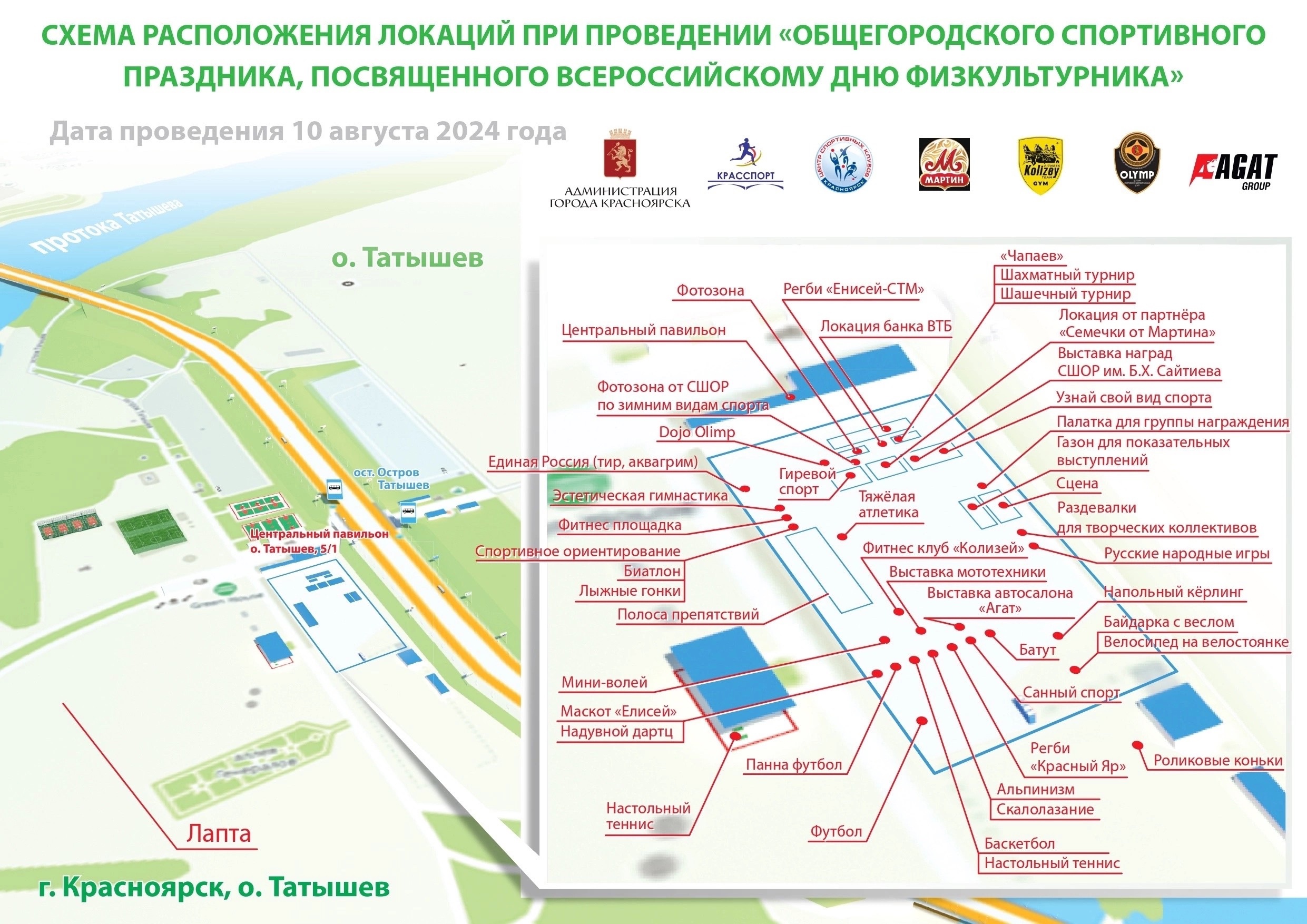В 10:00 на спортивных площадках острова начнутся соревнования по шахматам, настольному теннису, лапте. Для участия в этих видах спорта необходимо до 15:00 9 августа подать заявку. Кроме этого, пройдут показательные выступления городских и краевых спортивных школ.