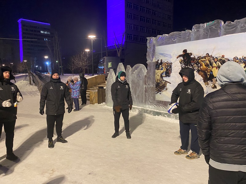 На Ярыгинской набережной установлена тёплая сцена, на которой по субботам пришедших людей ждёт насыщенная концертная программа. Среди развлечений и снежное регби от регбистов молодёжного состава «Красного Яра». Дети и взрослые не только могли сфотографироваться с парнями, но и попробовать покидать такой непослушный овальный мяч.