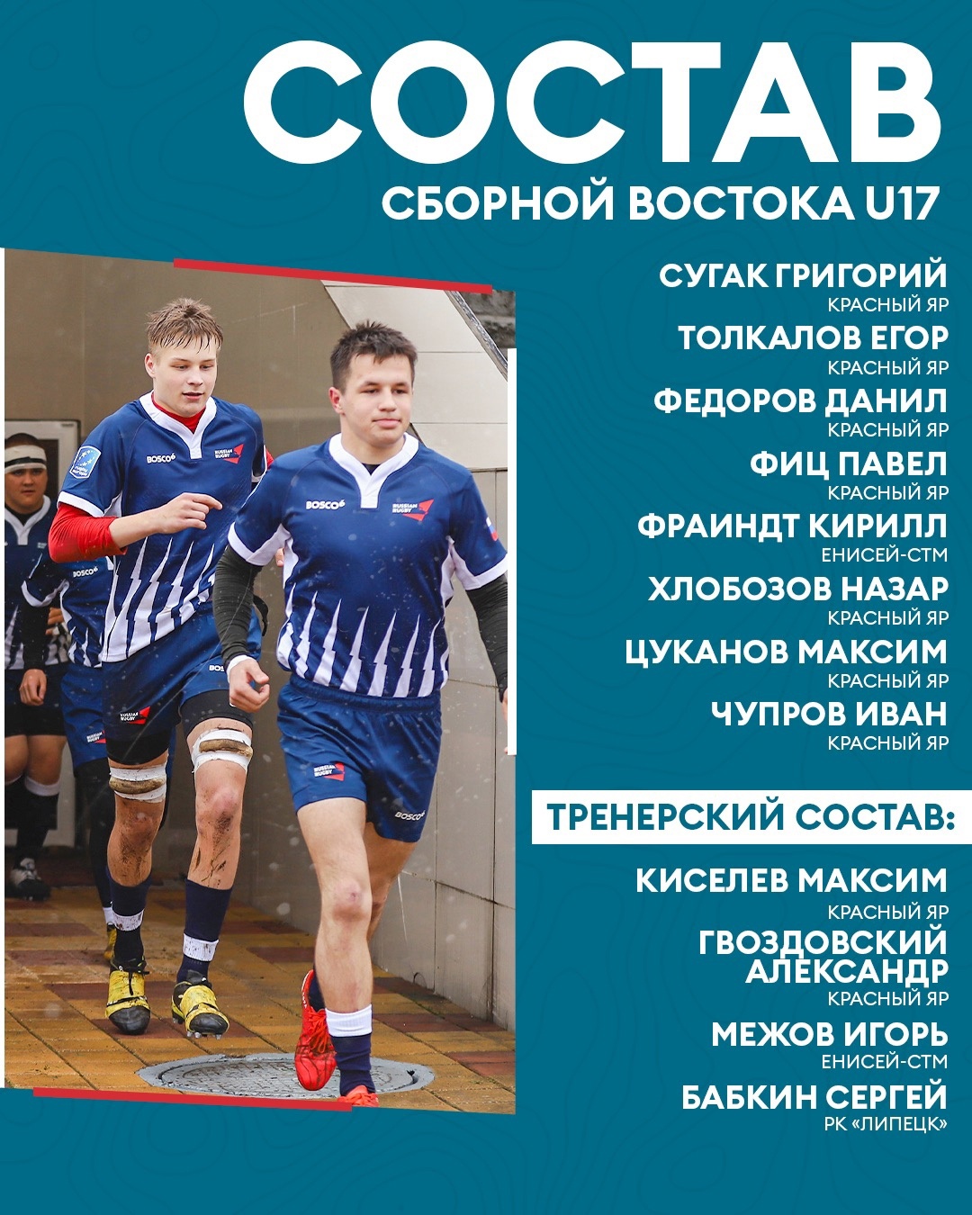 Игроки национальной сборной России не старше 17 лет (главный тренер Максим Киселёв) разделены на две команды по географическому принципу.