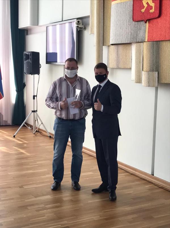 Награды в торжественной обстановке вручил Глава г. Красноярска Сергей Ерёмин. Эдуард Миллер пришёл на награждение на костылях, потому что залечивает травму ноги.
